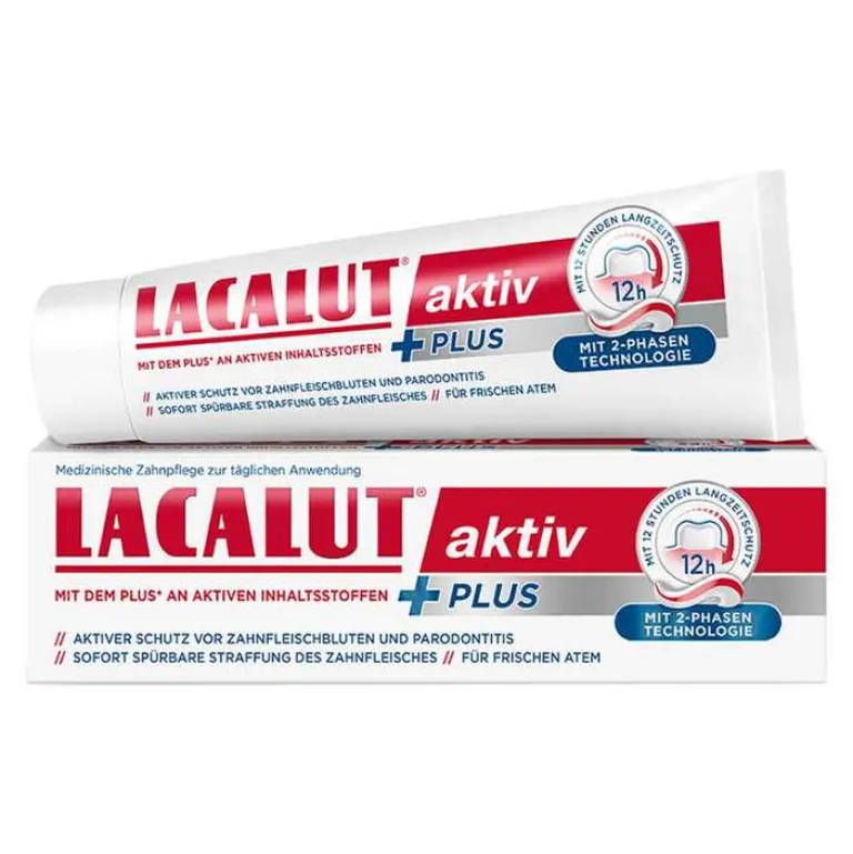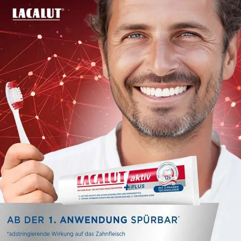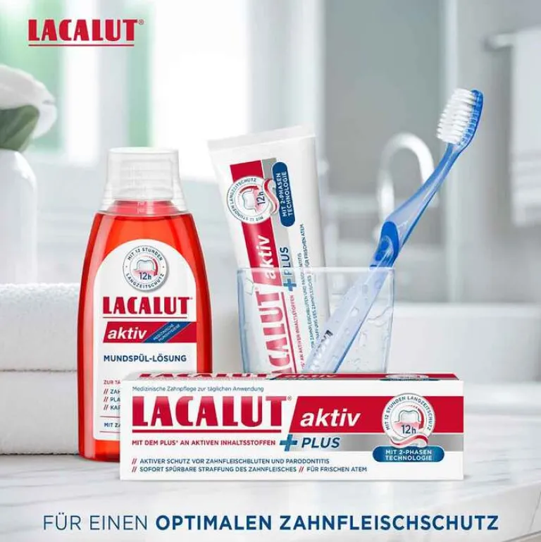 LACALUT aktiv Plus Zahncreme steht für eine umfassende Zahnpflege und ein strahlendes Lächeln, inklusive aktivem Schutz vor Zahnfleischentzündung, Karies, Zahnstein, entzündungsbedingtem Zahnfleischrückgang und Parodontitis.