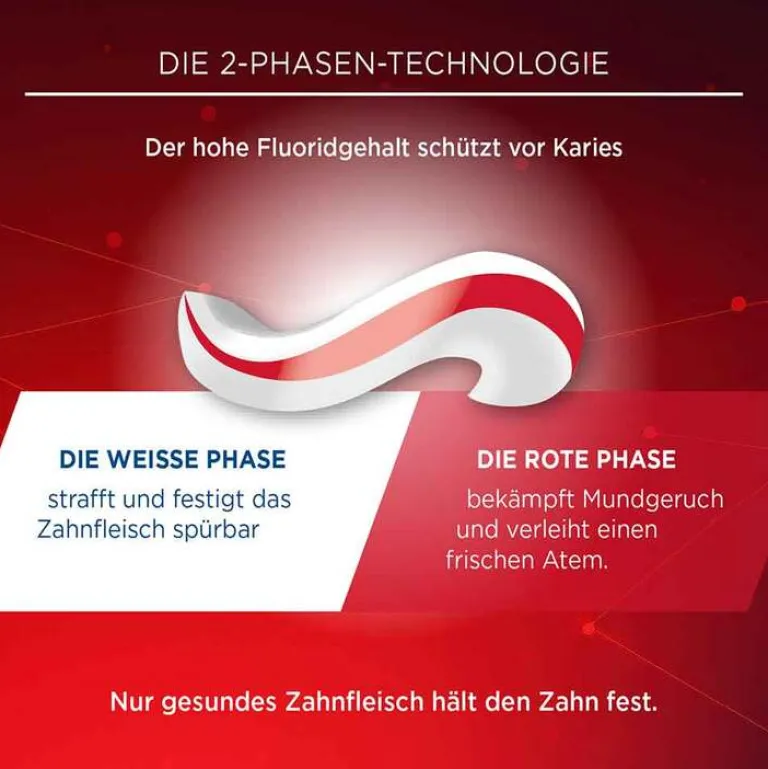Die einzigartige 2-Phasen Technologie setzt auf sofort spürbare Straffung und Festigung des Zahnfleischs in der weißen Phase, während die rote Phase Mundgeruch bekämpft und angenehmen, frischen Atem verleiht. Die Zahncreme schützt aktiv vor Zahnfleischbluten und Parodontitis.