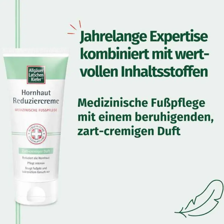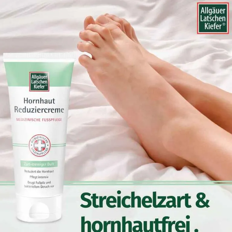 Die Hornhaut Reduziercreme Cremig von Allgäuer Latschenkiefer ist eine Fußpflege, die jahrelange Expertise mit wertvollen Inhaltsstoffen kombiniert. Sie wirkt sanft, aber dennoch effektiv bei der Reduzierung unerwünschter Hornhaut. Ihre Anti-Hornhaut-Formel kombiniert wertvolle Fruchtsäuren, wie Salicyl- und Glykolsäure, um Hornhaut gezielt zu reduzieren und das Hautbild sichtbar zu verbessern – und das bereits innerhalb weniger Tage.