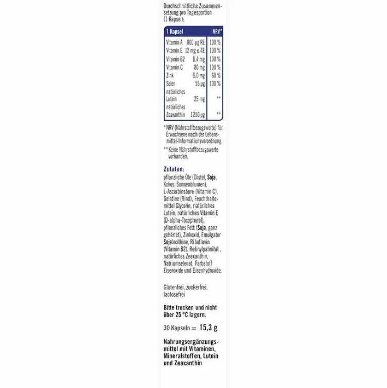 pflanzliche Öle (Distelöl, Sojaöl, Kokosöl, Sonnenblumenöl), L-Ascorbinsäure (Vitamin C), Gelatine (Rind), Feuchthaltemittel Glycerin, natürliches Lutein, natürliches Vitamin E (D-alpha-Tocopherol), pflanzliches Fett (Soja, ganz gehärtet), Zinkoxid, Emulgator Sojalecithine, Riboflavin (Vitamin B2), Retinylpalmitat, natürliches Zeaxanthin, Natriumselenat, Farbstoff Eisenoxide und Eisenhydroxide.