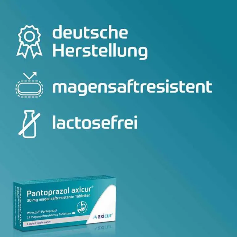 Pantoprazol axicur® 20 mg magensaftresistente Tabletten. Anwendungsgebiete: Zur kurzzeitigen Behandlung von Reflux-Symptomen (z.B. Sodbrennen, saures Aufstoßen) bei Erwachsenen. Enthält Maltitol und entölte Phospholipide aus Sojabohnen. Packungsbeilage beachten. Zu Risiken und Nebenwirkungen lesen Sie die Packungsbeilage und fragen Sie Ihre Ärztin, Ihren Arzt oder in Ihrer Apotheke. axicorp Pharma GmbH, 61381 Friedrichsdorf. Stand: April 2022