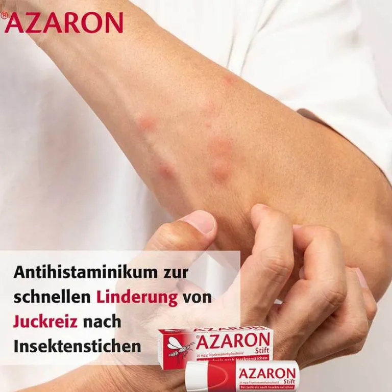 Azaron®Wirkstoff: Tripelennaminhydrochlorid. Anwendungsgebiete: Zur Linderung oder symptomatischen Beseitigung von Juckreiz nach Insektensti-chen oder -bissen und nach Kontakt mit Quallen oder Brennnesseln Enthält Propylenglycol. Packungsbeilage beachten! Zu Risiken und Nebenwirkungen lesen Sie die Packungsbeilage und fragen Sie Ihre Ärztin, Ihren Arzt oder in Ihrer Apotheke. Stand 10.2020