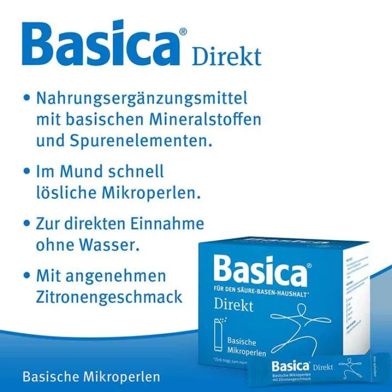 Basica Direkt® ist ideal für die schnelle Einnahme zu Hause, unterwegs, im Büro oder beim Sport. Die basischen Mikroperlen schmecken erfrischend nach Zitrone und lösen sich schnell im Mund auf.