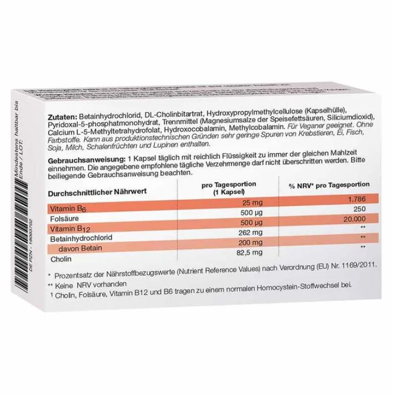 Betainhydrochlorid, DL-Cholinbitartrat, Hydroxypropylmethylcellulose (Kapselhülle), Pyridoxal-5-phosphatmonohydrat, Trennmittel (Magnesiumsalze der Speisefettsäuren, Siliciumdioxid), Calcium L-5-Methyltetrahydrofolat, Hydroxocobalamin, Methylcobalamin. Für Veganer geeignet.