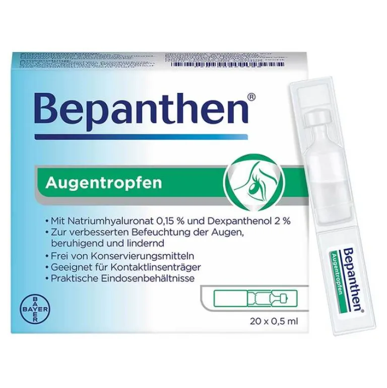 Wer an trockenen und gereizten Augen leidet, kann mit den Bepanthen® Augentropfen die Augenoberfläche befeuchten, den Tränenfilm stabilisieren und somit das Auge vor einem Trockenheitsgefühl schützen. Auf diese Weise wird eine Linderung der Beschwerden erreicht. Die Bepanthen® Augentropfen sind erhältlich als Ein-Dosis-Behältnis (praktisch für unterwegs) und in der Soft-Touch-Mehrdosisflache (insbesondere zur regelmäßigen Anwendung). Die Augentropfen enthalten weder Konservierungsstoffe noch Phosphate. Sie sind für Kontaktlinsenträger geeignet.
