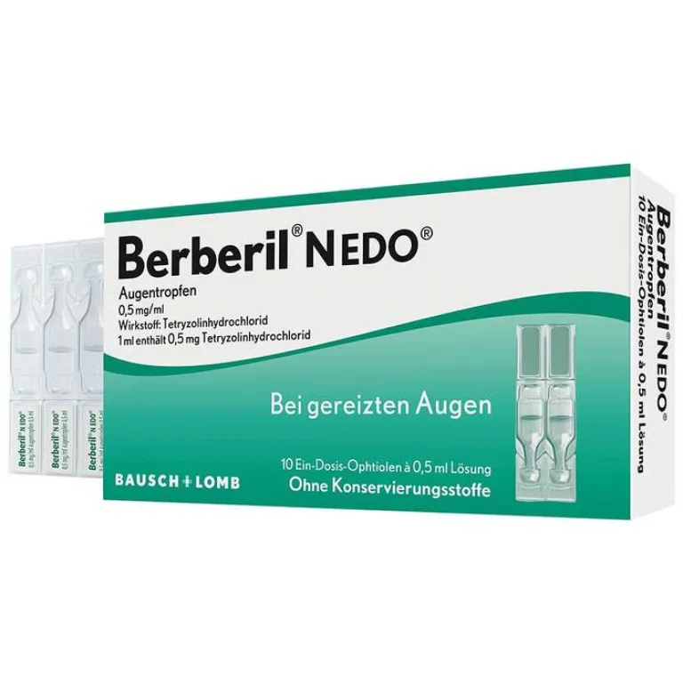 Berberil® N EDO® (Ein-Dosis-Ophtiole) Augentropfen mit dem bewährten Wirkstoff Tetryzolin (Tetryzolinhydrochlorid) beruhigen gereizte Augen minutenschnell. Sie eignen sich zur Behandlung von unspezifischen Augenreizungen und bei allergisch bedingten Entzündungen des Auges wie z. B. durch Heuschnupfen.