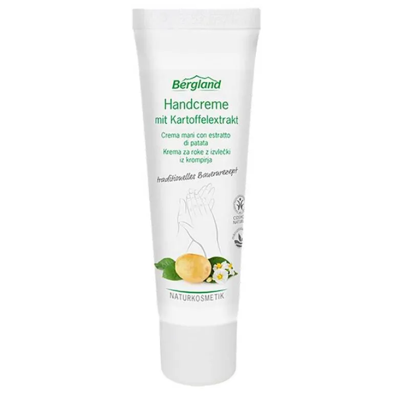 Äußere Einflüsse, häufiges Waschen und die tägliche Arbeit strapazieren die Hände. Die Haut wird spröde und rau, sie braucht jetzt eine schützende Intensivpflege. Der Kartoffelextrakt ist ein altes traditionelles Hausmittel zur Stärkung und eine echte Wohltat für raue Haut. Die Bergland Handcreme mit Kartoffelextrakt enthält die natürlichen Wirkstoffe der rohen Kartoffel, Mandel-Öl und Vitamin E. Sie duftet angenehm und zieht sehr schnell ein, ausgelaugte Hände werden weich und glatt.