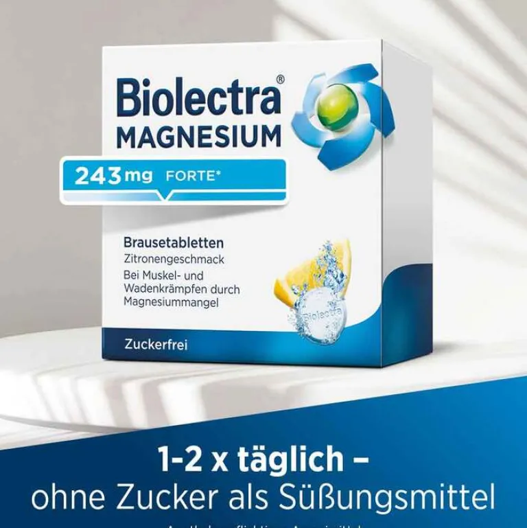 Biolectra® MAGNESIUM 243 mg forte Brausetabletten Zitronengeschmack Anwendungsgebiete: Nachgewiesener Magnesiummangel, wenn er Ursache für Störungen der Muskeltätigkeit (neuromuskuläre Störungen, Wadenkrämpfe) ist. Hinweise: Enthält Natrium, Kalium und Sorbitol. Zu Risiken und Nebenwirkungen lesen Sie die Packungsbeilage und fragen Sie Ihre Ärztin, Ihren Arzt oder in Ihrer Apotheke. Stand 12/2023