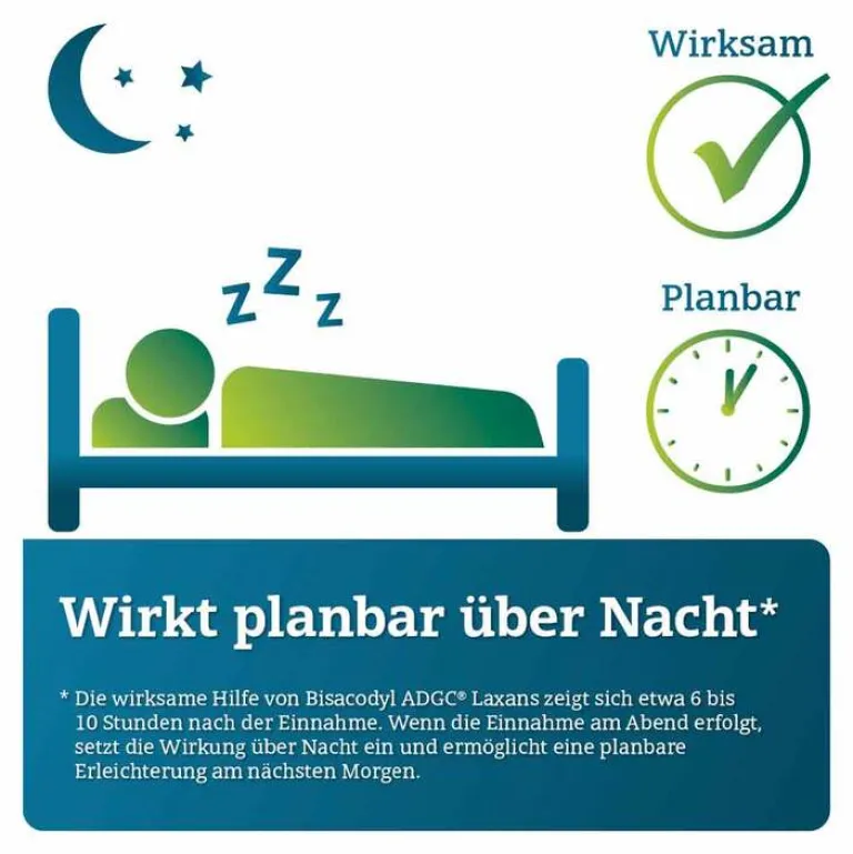 - Geeignet ab 6 Jahren: Bisacodyl ADGC® Laxans ist für die kurzfristige Behandlung von Verstopfung bei Erwachsenen, Jugendlichen und Kindern ab 6 Jahren geeignet.