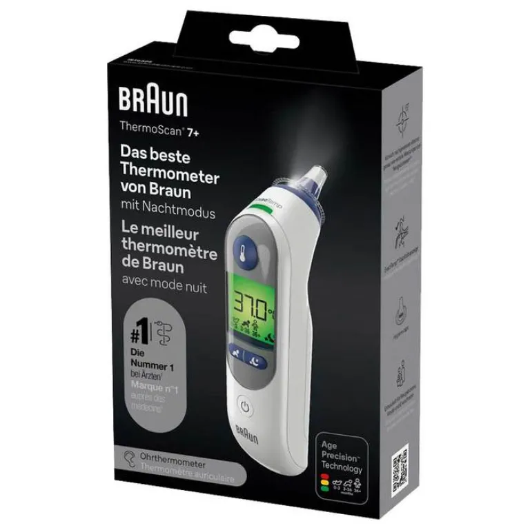 Das BRAUN Ohrfieberthermometer ThermoScan 7+vom bekannten Markenhersteller Braun bietet Ihnen eine einfache Bedienung sowie eine schnelle, präzise und zuverlässige Temperaturmessung. Infrarot-Ohrthermometer mit altersabhängig einstellbaren Fiebergrenzwerten für die ganze Familie.