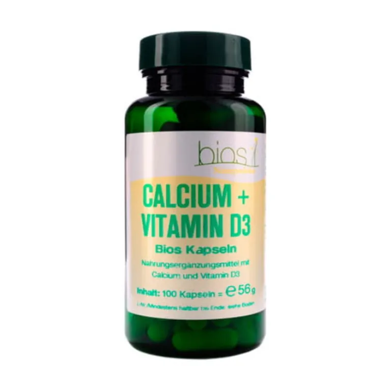 Calcium + Vitamin D3 Bios Kapseln enthalten 133 mg Calcium als Calciumcarbonat und Calciumcitrat und zusätzlich 0,83 µg Vitamin D3 (Colecalciferol) in einer Hartgelatinekapsel. Sowohl Calcium als auch Vitamin D3 können zur täglichen Nahrungsergänzung empfohlen werden, wobei die empfohlenen Tageszufuhren 800 mg Calcium und 5 µg Vitamin D3 betragen (RDA).