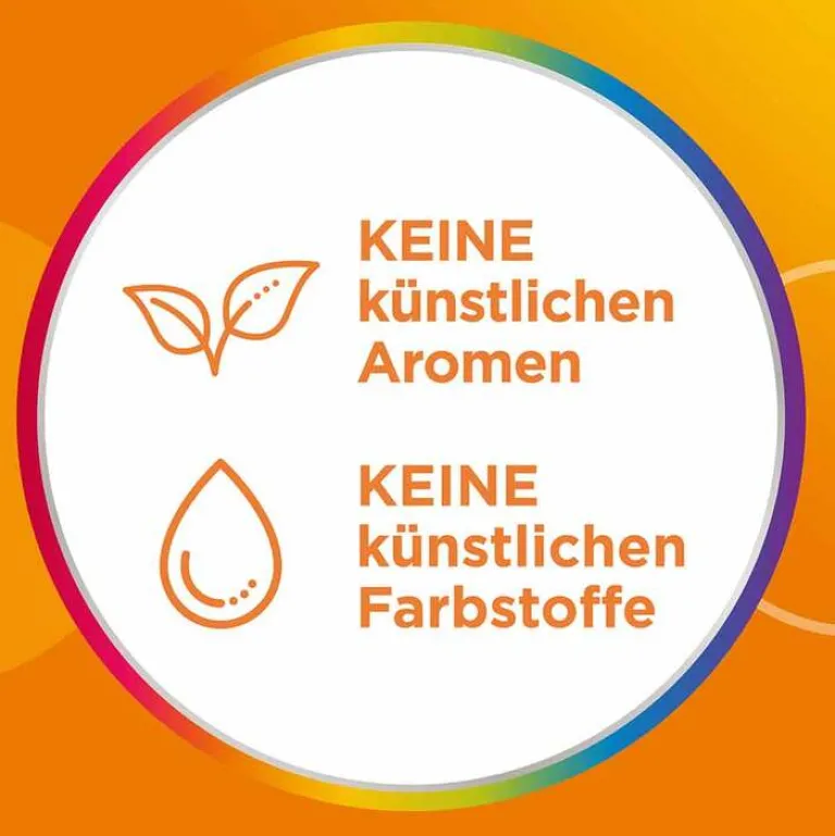 Glukosesirup; Zucker; Gelatine; L-Ascorbinsäure; Wasser; Maltodextrin; DL-alpha-Tocopherylacetat; Zinksulfat; Säuerungsmittel: Citronensäure; natürliches Orangenaroma; färbende Lebensmittelkonzentrate (Paprika, Karotte); pflanzliche Öle (Kokos-, Rapsöl); Süßungsmittel: Steviolglycoside; Retinylacetat; Überzugsmittel: Carnaubawachs, Bienenwachs; Cholecalciferol.