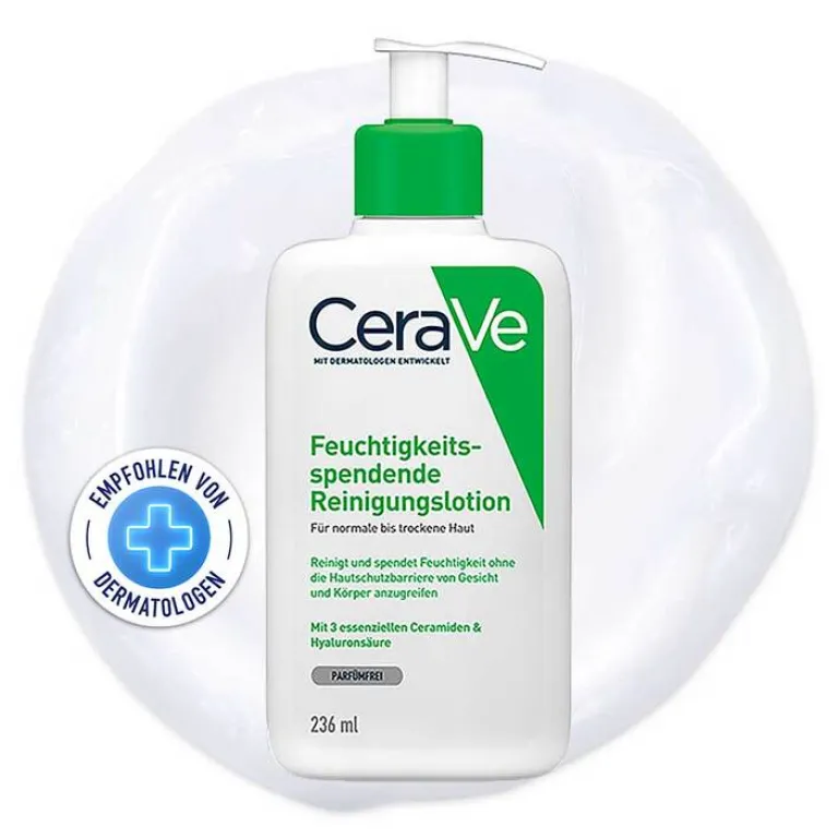 Die CeraVe Feuchtigkeitsspendende Reinigungslotion für trockene Haut in die Handflächen geben und auf das angefeuchtete Gesicht odern den Körper auftragen. Anschließend sanft einmassieren und mit lauwarmem Wasser gründlich abspülen.