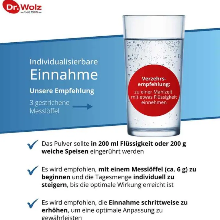Darm activ Dr. Wolz ist ein lösliches, nicht quellendes Präparat, das in kalte Getränke (z.B. ein Glas Wasser ohne Kohlensäure) oder auch weiche, kalte Speisen eingerührt werden kann. Aufgrund des mikrobiologischen Wirkprinzips sollte der Verzehr von Darm activ Dr. Wolz langsam gesteigert werden. Fangen Sie mit einem Messlöffel (ca. 7 g) an und steigern Sie individuell die Tagesmenge, z.B. jede Woche einen Löffel mehr, bis Sie die optimale Wirkung spüren. Die Tagesempfehlung sind 3 gestrichene Messlöffel (= 21 g), die Sie in 200 ml Flüssigkeit Ihrer Wahl oder 200 g weiche Speisen geben und dabei gut verrühren bis sich das Pulver gelöst hat. Eine zu schnelle Steigerung könnte zu Blähungen führen, da sich die Dickdarmflora noch nicht an Darm activ Dr. Wolz angepasst hat.