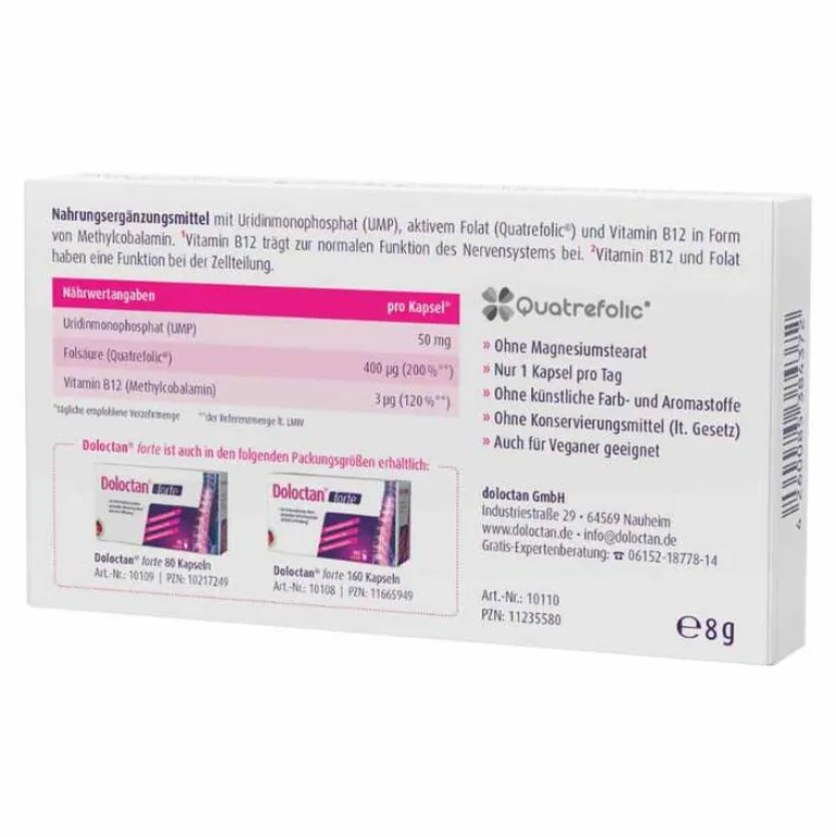Darreichungsform:KapselnPackungsgröße:40 StPZN:11235580Anbieter/Hersteller:doloctan GmbHMarke/Präparat:DoloctanNahrun…