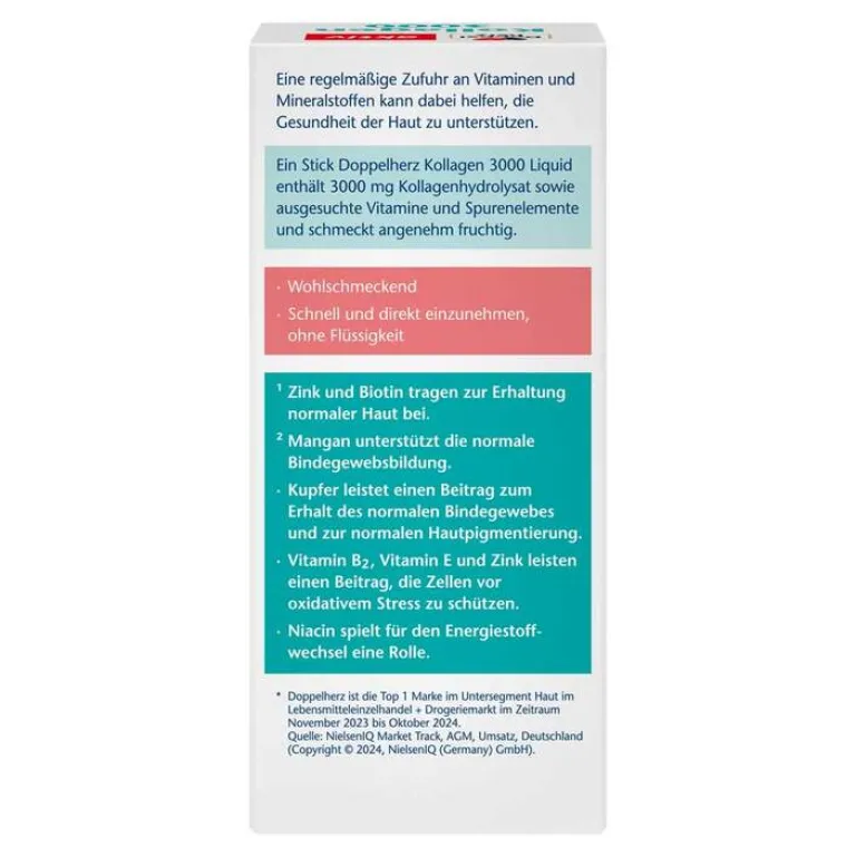 Ein Stick Doppelherz Kollagen 3000 Liquid enthält 3000 mg Kollagenhydrolysat und ausgesuchte Vitamine und Spurenelemente und schmeckt angenehm fruchtig.