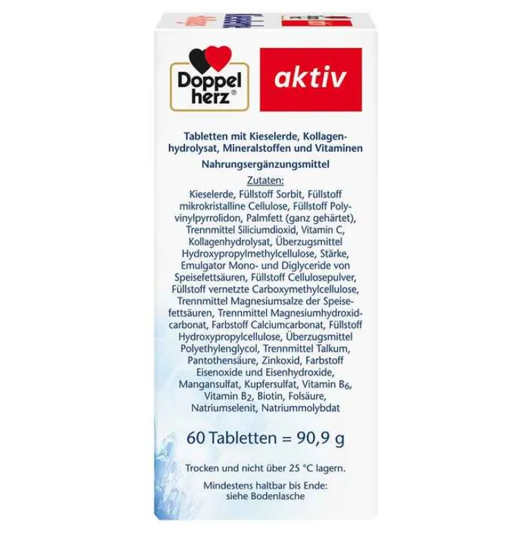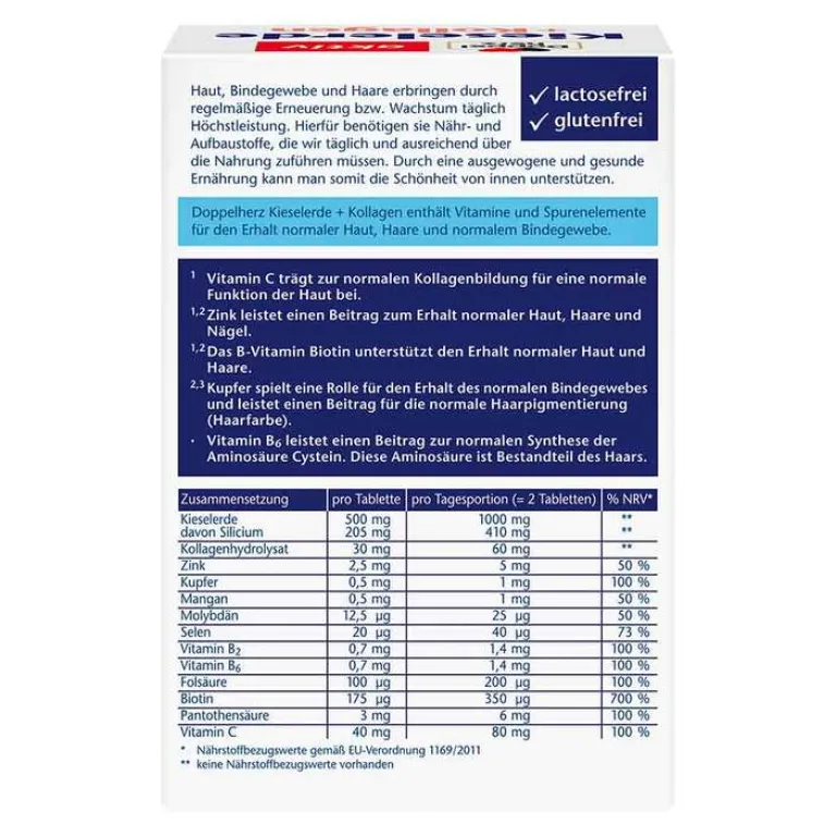 Haut, Bindegewebe und Haare erbringen durch regelmäßige Erneuerung bzw. Wachstum täglich Höchstleistung. Hierfür benötigen sie Nähr- und Aufbaustoffe, die wir täglich und ausreichend über die Nahrung zuführen müssen. Durch eine ausgewogene und gesunde Ernährung kann man somit die Schönheit von innen unterstützen.* Die Kombination der Nährstoffe in Doppelherz Kieselerde + Kollagen trägt zusätzlich zum Erhalt normaler Haut, Haare und normalen Bindegewebes bei.* Zink leistet einen Beitrag zum Erhalt normaler Haut, Haare und Nägel.* Vitamin C trägt zur normalen Kollagenbildung für eine normale Funktion der Haut bei.* Das B-Vitamin Biotin unterstützt den Erhalt normaler Haut und Haare.* Vitamin B6 leistet einen Beitrag zur normalen Synthese der Aminosäure Cystein.* Diese Aminosäure ist Bestandteil des Haars. Kupfer spielt eine Rolle für den Erhalt des normalen Bindegewebes und leistet einen Beitrag für die normale Haarpigmentierung (Haarfarbe).*
