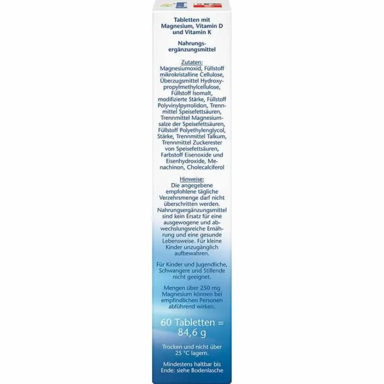 * Magnesium trägt zur normalen Funktion der Muskeln bei und unterstützt die normale Funktion des Nervensystems. Vitamin D + K tragen zum Erhalt normaler Knochen bei. Vitamin D trägt zum Erhalt einer normalen Funktion des Immunsystems bei.