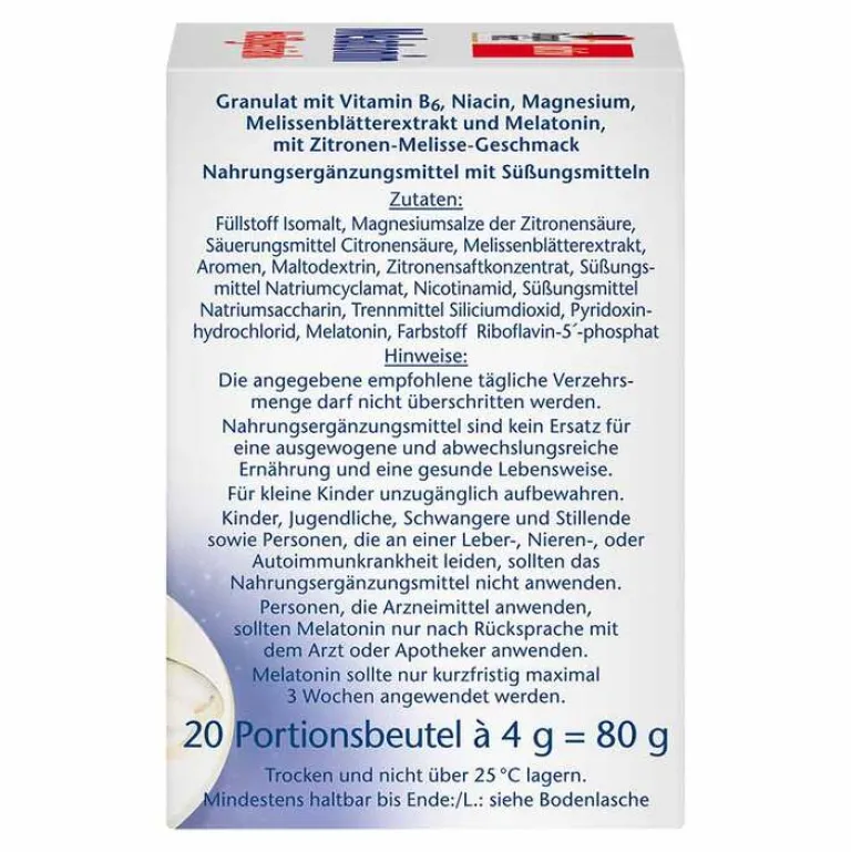 - Granulat mit Vitamin B6, Niacin, Magnesium, Melissenblätterextrakt und Melatonin