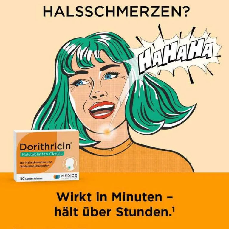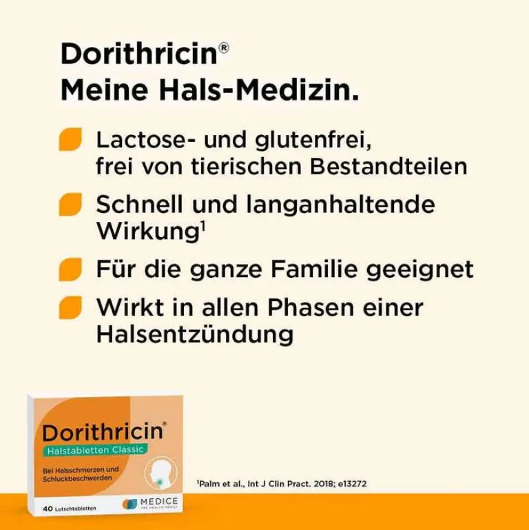Dorithricin® Halstabletten Classic. Anwendungsgebiete: Zur symptomatischen Behandlung bei Infektionen des Mund- und Rachenraumes mit Halsschmerzen und Schluckbeschwerden. Enthält Sorbitol und Minzöl. Zu Risiken und Nebenwirkungen lesen Sie die Packungsbeilage und fragen Sie Ihre Ärztin, Ihren Arzt oder in Ihrer Apotheke. Stand 04/2022. MEDICE Arzneimittel, 58638 Iserlohn.
