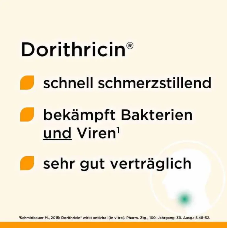 Dorithricin® enthält unter anderem einen bewährten, lokal schmerzstillenden Wirkstoff in einer medizinisch sinnvollen Dosierung. Der Vorteil: Dorithricin® bekämpft Halsschmerzen und Schluckbeschwerden schnell und langanhaltend, ohne dass dabei ein unangenehmes Taubheitsgefühl im Mund entsteht.