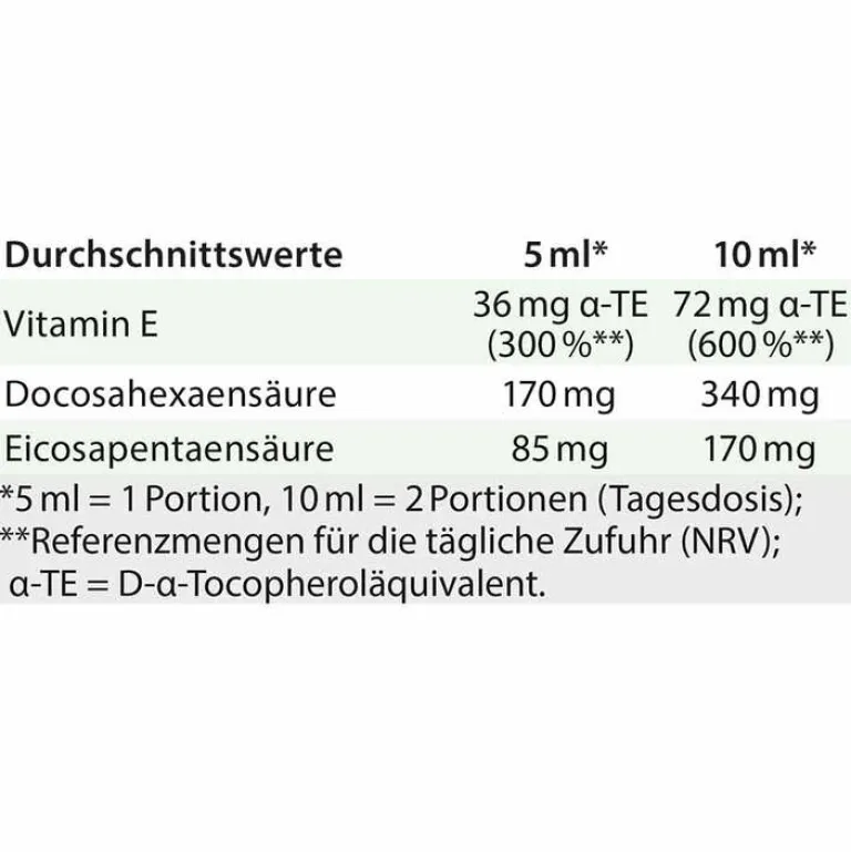 Eine Portion DHA + EPA vegan TocoProtect (5 ml) enthält bereits 250 mg DHA und EPA. Diese Menge trägt bei einer täglichen Aufnahme zu der normalen Funktion des Herzens bei. 7,5 ml DHA + EPA vegan TocoProtect täglich unterstützen zudem mit 250 mg DHA die Erhaltung einer normalen Sehkraft und der normalen Gehirnfunktion.