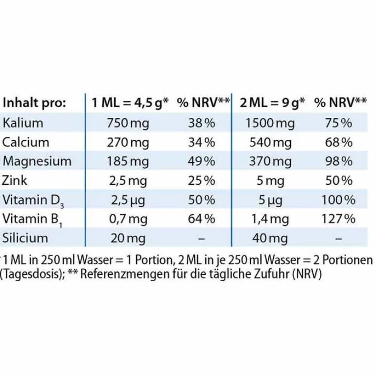 Bei (medikamentenbedingten) Störungen des Kaliumhaushaltes, Alkalose, Hyperkaliämie oder Nierenversagen erst nach ärztlicher Beratung verwenden. Die volle Tagesdosis (= 2 Portionen) ist für Personen ab 15 Jahren geeignet. Bei Einnahme der vollen Tagesdosis benötigen Sie keine weiteren Nahrungsergänzungsmittel mit Calcium oder Zink.