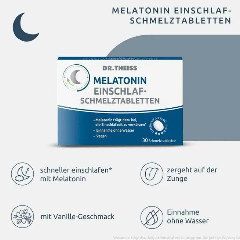 Die Dr. Theiss Melatonin Einschlaf-Schmelztabletten zergehen auf der Zunge. Melatonin trägt dazu bei, die Einschlafzeit zu verkürzen¹. Die Schmelztabletten werden ohne Wasser vor dem Schlafengehen eingenommen und sind mit Vanille-Geschmack.