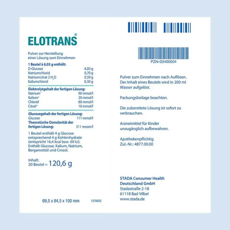 Elotrans® Pulver zur Herstellung einer Lösung zum Einnehmen Wirkstoffe: D-Glucose, Natriumchlorid, Natriumcitrat, Kaliumchlorid. Zur oralen Salz- (Elektrolyt-) und Flüssigkeitszufuhr (Ausgleich von Salz- und Wasserverlusten) bei Durchfallerkrankungen. Hinweise: Jeder Durchfall kann Anzeichen einer schweren Erkrankung sein. Bei längerer Dauer und/oder Beeinträchtigung des Allgemeinbefindens ist daher unverzüglich ein Arzt aufzusuchen. Insbesondere bei Säuglingen und Kleinkindern können Durchfälle, besonders bei gleichzeitigem, unstillbarem Erbrechen, rasch zu schweren Krankheitserscheinungen (Bewusstseinstrübung, Schock) führen. Es ist daher bei der Durchfallbehandlung von Säuglingen und Kleinkindern in jedem Fall ein Arzt hinzuzuziehen. Enthält Glucose, Kaliumchlorid und Natriumverbindungen. Zu Risiken und Nebenwirkungen lesen Sie die Packungsbeilage und fragen Sie Ihre Ärztin, Ihren Arzt oder in Ihrer Apotheke. STADA Consumer Health Deutschland GmbH, Stadastraße 2–18, 61118 Bad Vilbel | Stand: September 2019