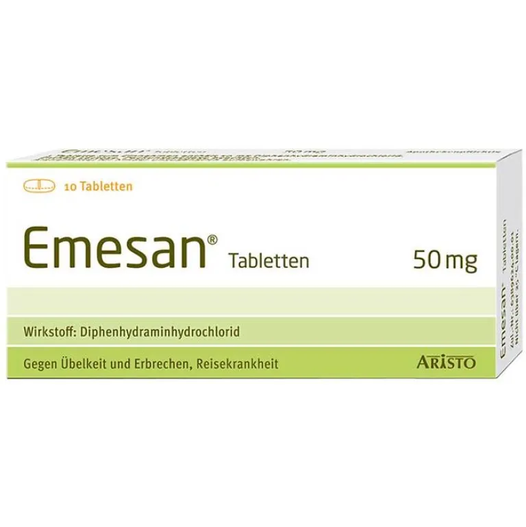 Emesan® Tabletten, 50 mg (Ap). Wirkstoff: Diphenhydraminhydrochlorid. Zur Vorbeugung und symptomatischen Behandlung von Übelkeit und Erbrechen unterschiedlicher Ursache, insbesondere bei Reisekrankheit. Enthält Lactose. Packungsbeilage beachten. Zu Risiken und Nebenwirkungen lesen Sie die Packungsbeilage und fragen Sie Ihren Arzt oder Apotheker. (Stand Juli 2019). Aristo Pharma GmbH, Wallenroder 8-10, 13435 Berlin.
