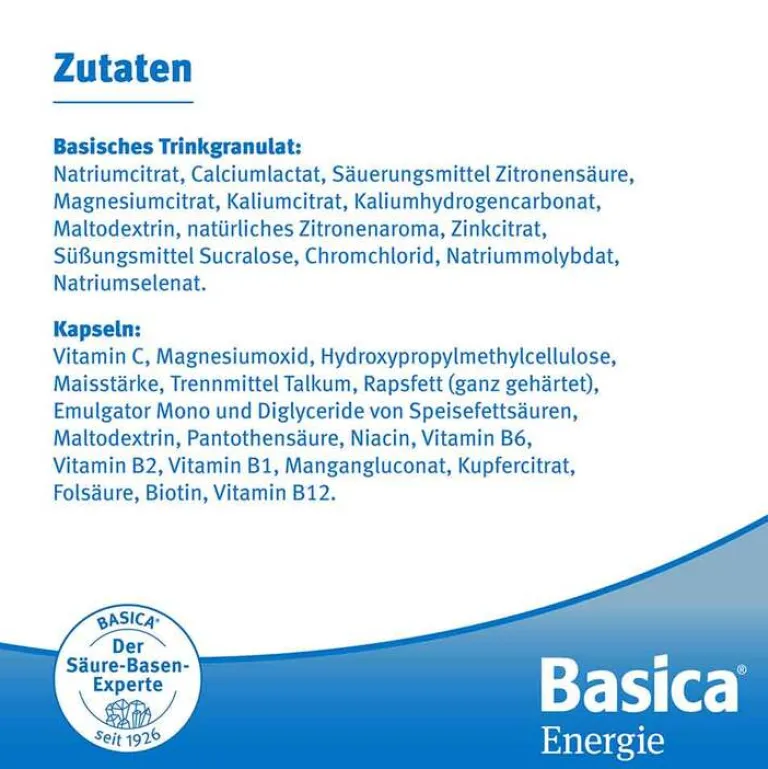 Im Basica Trinkgranulat und Kapseln sind hochdosierte Mikronährstoffe für die körpereigene Energie* und die geistige Leistungsfähigkeit* enthalten. Das basische Trinkgranulat unterstützt mit Zink den normalen Säure-Basen-Stoffwechsel.*