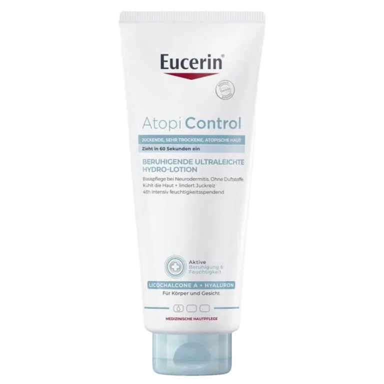 Die Eucerin AtopiControl beruhigende ultraleichte Hydro-Lotion ist eine täglich anzuwendende Basispflege, die speziell entwickelt wurde, um gereizte und juckende Haut zu beruhigen und intensiv Feuchtigkeit zu spenden. Mit der in der Neurodermitis Creme enthaltenen Kombination aus Licochalcone A (Süßholzwurzelextrakt), Hyaluronsäure und Ceramiden entsteht eine sofortige Linderung für juckende Haut, indem Juckreiz am ganzen Körper gemildert wird. Die Eucerin Lotion beruhigt zugleich bei Hautekzemen und sorgt für langanhaltendes Wohlbefinden der Haut. Bei regelmäßiger Anwendung der Hautpflege verbessert sich der Hautzustand spürbar, die Haut wird weicher und fühlt sich geschmeidiger an.