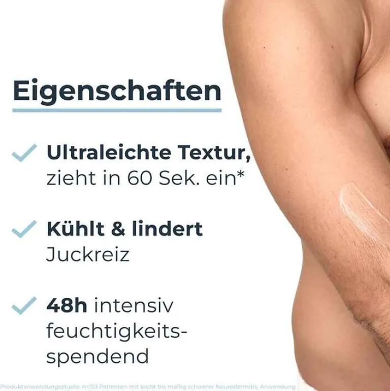 Die als Creme bei Ekzemen geeignete parfümfreie Bodylotion ist frei von Mikroplastik gemäß UNEP-Definition. In einer Studie bestätigen 92% der Teilnehmenden, dass die Eucerin Lotion den Juckreiz sofort lindert.