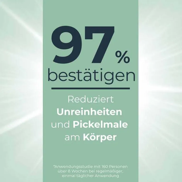 Die Effekte nach der Anwendung: Sofort spendet die Hautcreme mit Glycerin Feuchtigkeit, nach zwei Wochen täglichen Nutzens der Akne Hautpflege lässt sich reinere Haut feststellen. 97 % der Probanden in einer Studie über acht Wochen bestätigten, dass Unreinheiten und Pickelmalen am Körper* reduziert waren. Die klinisch getestete Bodylotion ist zudem frei von Mikroplastik (gemäß UNEP-Definition).