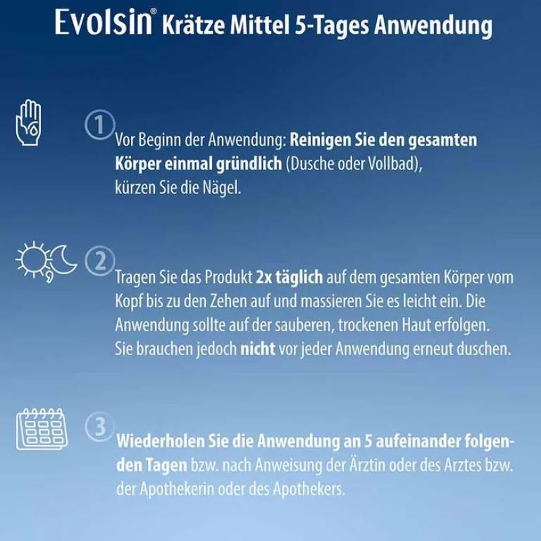EVOLSIN® KRÄTZE MITTEL bildet auf der Haut einen schützenden Lipidfilm. Dieser schafft eine parasitenfeindliche, für die Besiedelung ungünstige Umgebung. Gleichzeitig lindert EVOLSIN® KRÄTZE MITTEL den Juckreiz.