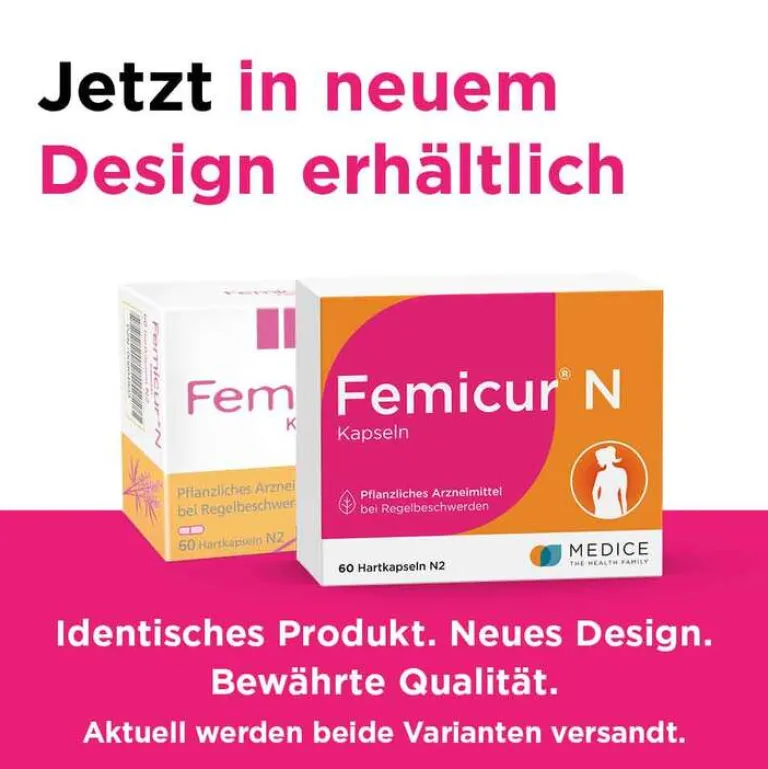 Femicur® N Kapseln, Wirkstoff: Mönchspfefferfrüchte-Trockenextrakt. Anwendungsgebiete: Rhythmusstörungen der Regelblutung (Regeltempoanomalien), monatlich wiederkehrende Beschwerden vor Eintritt der Regelblutung (prämenstruelle Beschwerden), Spannungs- und Schwellungsgefühl in den Brüsten (Mastodynie). Warnhinweis: Enthält Glucose und Lactose; Packungsbeilage beachten! Zu Risiken und Nebenwirkungen lesen Sie die Packungsbeilage und fragen Sie Ihre Ärztin, Ihren Arzt oder in Ihrer Apotheke. Apothekenpflichtig. Stand: 11/2023. Schaper & Brümmer GmbH & Co. KG, Bahnhofstr. 35, 38259 Salzgitter