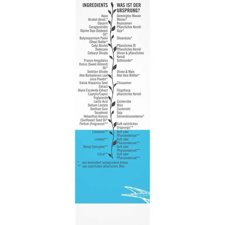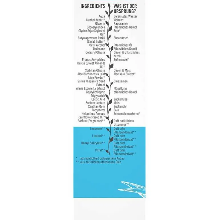 Aqua (Water), Alcohol denat.*, Glycerin, Cocoglycerides, Glycine Soja (Soybean) Oil*, Butyrospermum Parkii (Shea) Butter*, Cetyl Alcohol, Dodecane, Cetearyl Olivate, Prunus Amygdalus Dulcis (Sweet Almond) Oil*, Sorbitan Olivate, Aloe Barbadensis Leaf Juice Powder*, Salvia Hispanica Seed Extract, Alaria Esculenta Extract, Caprylic/Capric Triglyceride, Lactic Acid, Sodium Lactate, Xanthan Gum, Tocopherol, Helianthus Annuus (Sunflower) Seed Oil*, Parfum (Fragrance)**, Limonene**, Linalool**, Benzyl Salicylate**, Citral**