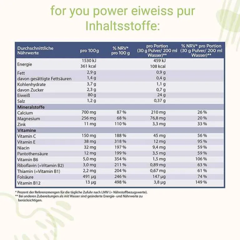 Das Eiweißpulver ist eine Mischung aus vier biologisch sehr hochwertigen Proteinquellen. Es ist gut löslich & fettarm. Durch die Kombination verschiedener Eiweißquellen hat es eine ausgewogene Bilanzierung aller Aminosäuren. For You Eiweiß Power setzt sich aus vier hochwertigen Eiweißkomponenten zusammen.