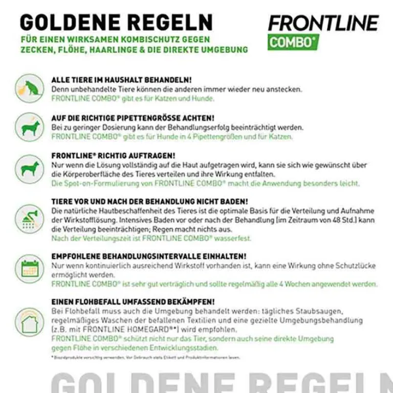 FRONTLINE COMBO® Spot on Katze, Lösung zum Auftropfen auf die Haut, für Katzen und Frettchen. Anwendungsgebiete: Für Katzen: Gegen Flohbefall, allein oder in Verbindung mit Zecken und/oder Haarlingsbefall. Abtötung von Flöhen (Ctenocephalides spp.). Die insektizide Wirkung auf adulte Flöhe bleibt 4 Wochen lang erhalten. Die Vermehrung der Flöhe wird durch Entwicklungshemmung der Eier (ovizide Wirkung) sowie der Larven und Puppen (larvizide Wirkung), die von den gelegten Eiern erwachsener Flöhe stammen, 6 Wochen lang nach der Behandlung verhindert. Abtötung von Zecken (Ixodes ricinus, Dermacentor variabilis, Rhipicephalus sanguineus). Die akarizide Wirksamkeit des Tierarzneimittels gegen Zecken hält bis zu 2 Wochen an (gemäß experimenteller Untersuchungen). Abtötung von Haarlingen (Felicola subrostratus). Anwendung des Tierarzneimittels als Teil einer Behandlungsstrategie zur Behandlung und Kontrolle der Flohstichallergie (FAD). Für Frettchen: Gegen Flohbefall, allein oder in Verbindung mit Zecken. Abtötung von Flöhen (Ctenocephalides spp.). Die insektizide Wirkung auf adulte Flöhe bleibt 4 Wochen lang erhalten. Die Vermehrung der Flöhe wird durch Entwicklungshemmung der Eier (ovizide Wirkung) sowie der Larven und Puppen (larvizide Wirkung), die von den gelegten Eiern erwachsener Flöhe stammen, verhindert. Abtötung von Zecken (Ixodes ricinus). Die akarizide Wirksamkeit des Tierarzneimittels gegen Zecken hält für 4 Wochen an (gemäß experimenteller Untersuchungen). Apothekenpflichtig. [12.2020] Boehringer Ingelheim Vetmedica GmbH, 55216 Ingelheim. Zu Risiken und Nebenwirkungen lesen Sie die Packungsbeilage und fragen Sie Ihren Tierarzt oder Apotheker
