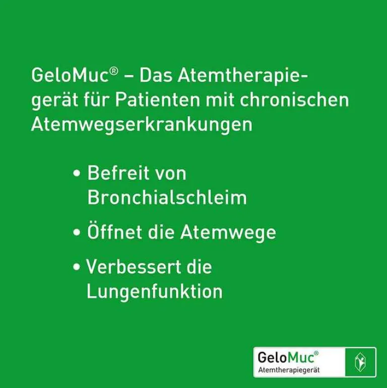 GeloMuc® ist ein Atemtherapiegerät zur Mobilisation von festsitzendem, zähem Bronchialschleim (auch bei verengten Atemwegen), wie z.B. bei Patientinnen und Patienten mit chronischer Bronchitis, chronisch obstruktiver Bronchitis (COPD), Asthma bronchiale, Lungenemphysem, Bronchiektasen oder Mukoviszidose.