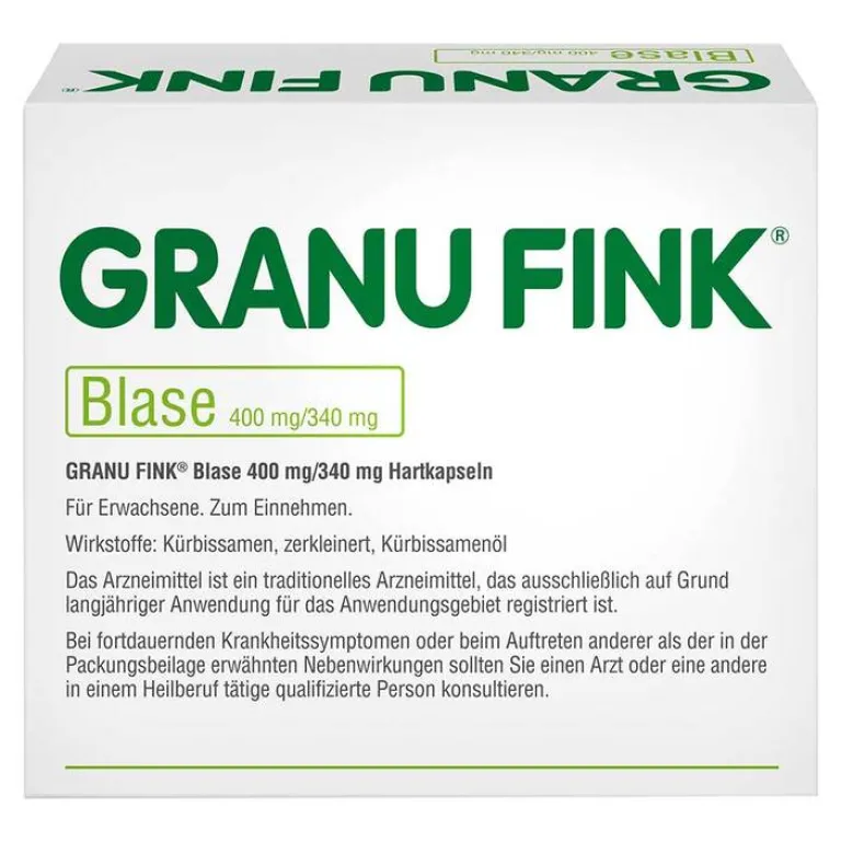 GRANU FINK® BLASE Anwendungsgebiete: Traditionell angewendet zur Stärkung oder Kräftigung der Blasenfunktion. Traditionelles pflanzliches Arzneimittel zur Anwendung z.B. bei Blasenschwa¨che, zur Erhaltung der normalen Blasenfunktion, zur Erleichterung der Blasenentleerung, ausschließlich auf Grund langjähriger Anwendung. Dieses Arzneimittel wird angewendet bei Erwachsenen ab 18 Jahren. Das Vorliegen einer schwerwiegenden Grunderkrankung als Ursache für die Beschwerden muss vor der Behandlung von einem Arzt ausgeschlossen worden sein. Bei fortdauernden Krankheitssymptomen oder beim Auftreten anderer als der in der Packungsbeilage erwa¨hnten Nebenwirkungen sollten Sie einen Arzt oder eine andere in einem Heilberuf ta¨tige qualifizierte Person konsultieren. Zu Risiken und Nebenwirkungen lesen Sie die Packungsbeilage und fragen Sie Ihre Ärztin, Ihren Arzt oder in Ihrer Apotheke.