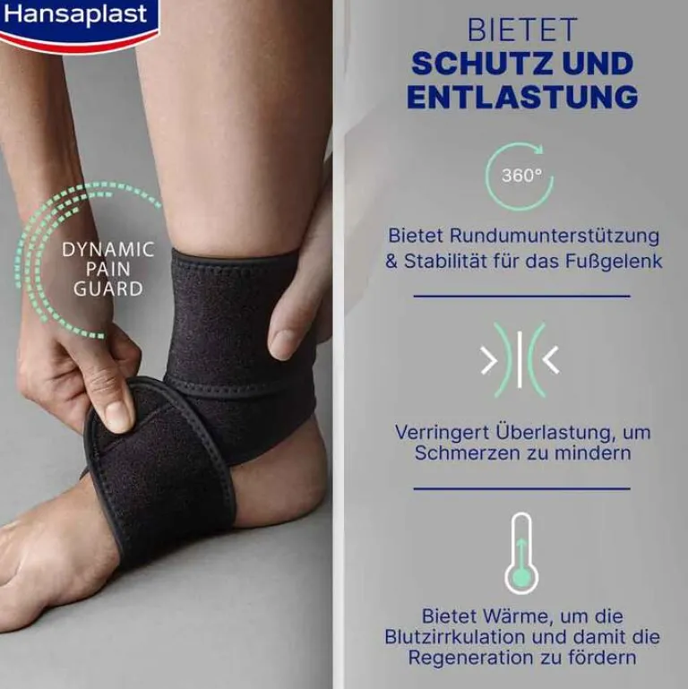 Die verstellbare Hansaplast Protective Fußgelenk-Bandage bietet Stabilität für schwache oder verletzte Fußgelenke und bietet Schutz vor weiteren Verletzungen. Die Sprunggelenkbandage bietet einen moderaten Stützgrad während der Bewegung und das Kompressionslevel kann individuell angepasst werden.