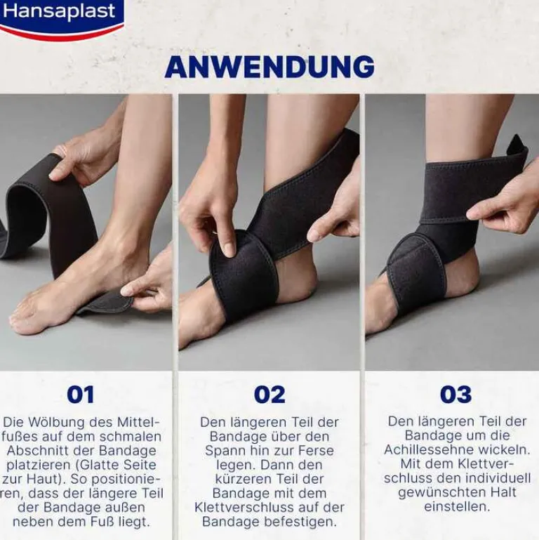 Die Fußgelenk-Bandage sollte nur auf sauberer, unverletzter Haut angewendet werden. Stellen Sie sicher, dass die Bandage weder zu eng anliegt noch die Blutzirkulation einschränkt. Vermeiden Sie das Tragen über einen längeren Zeitraum oder während des Schlafes.