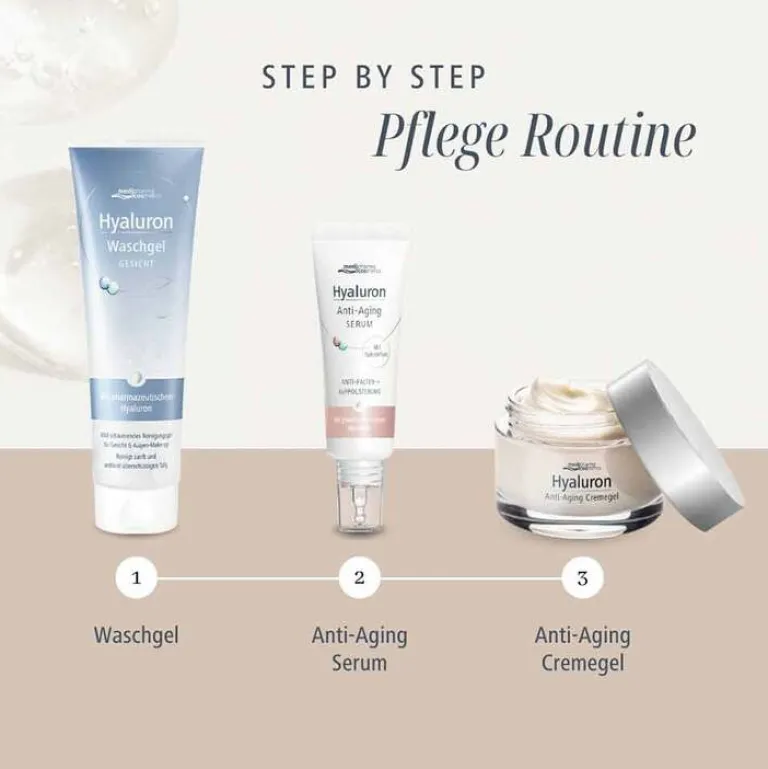 Für eine gründliche Pflege-Routine werden folgende Schritte empfohlen: Gestartet wird mit dem Hyaluron Waschgel, anschließend wird das Hyaluron Anti-Aging Serum auf die Haut aufgetragen und zum Schluss wird das Cremegel angewandt. Das Waschgel reinigt und entfernt Make-Up sowie überschüssigen Talg, das leichte, fast wässrige Serum reduziert Fältchen mit Soforteffekt und das Cremegel versorgt die Haut langanhaltend mit wichtigen Nährstoffen sowie Feuchtigkeit. Für eine Hautpflege mit System.