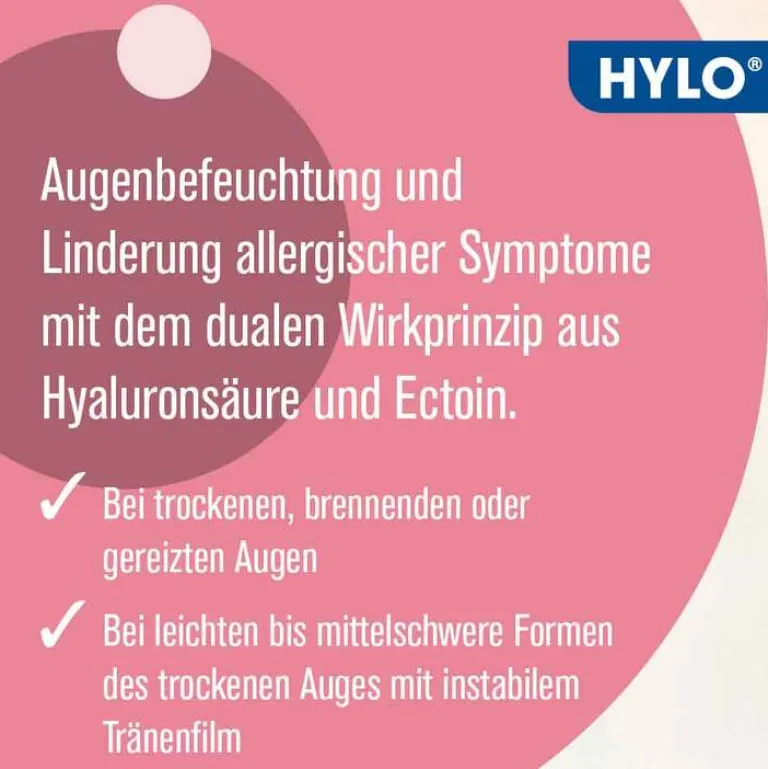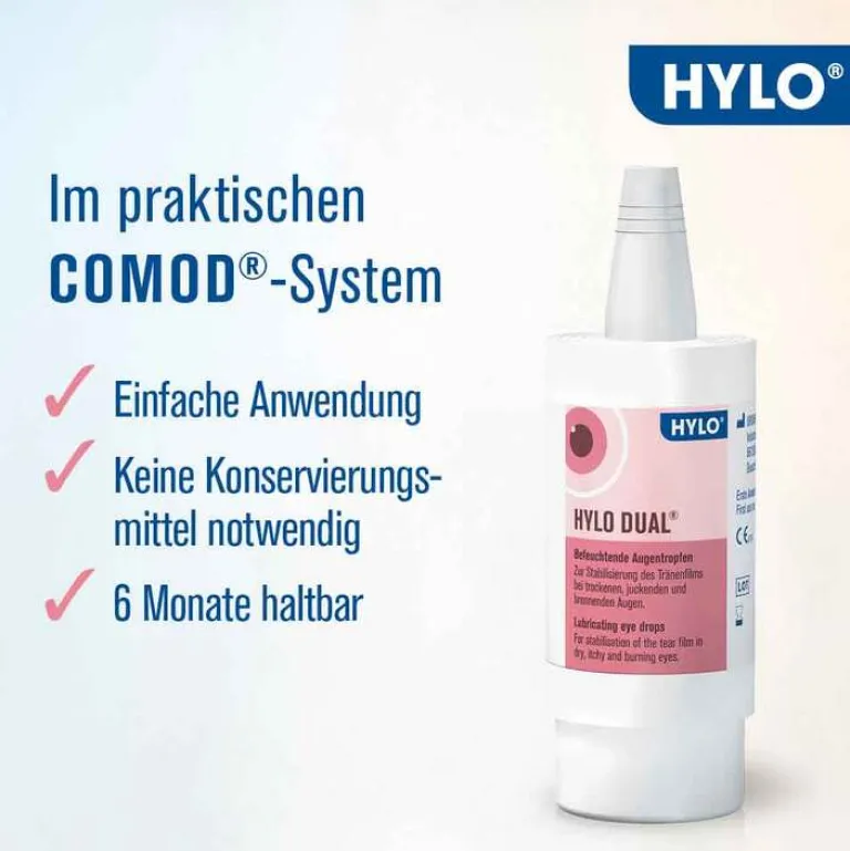 Wenn die Augen jucken oder brennen, schnell ermüden oder tränen, sind das meist typische Anzeichen des trockenen Auges und der mangelnden Versorgung mit Tränenflüssigkeit. Die gleichen Beschwerden können auch als Überempfindlichkeitsreaktion auf bestimmte Substanzen wie beispielsweise Pollen, Tierhaare oder Hausstaub auftreten. HYLO DUAL® Augentropfen wurden insbesondere für trockene oder durch Allergien gereizte Augen entwickelt. Die Kombination aus Hyaluronsäure und Ectoin sorgt für die effektive Befeuchtung der gereizten Augen, lindert entzündliche und allergische Symptome und stabilisiert den Tränenfilm. Gleichzeitig wird ein nachhaltiger Schutz vor erneuter Austrocknung aufgebaut und die körpereigene Barriere bei der Abwehr allergieverursachender Substanzen und Reizstoffe unterstützt. HYLO DUAL® Augentropfen sind dank des patentierten COMOD® Systems besonders ergiebig (mind. 300 Tropfen pro Flasche) und gut verträglich. Das spezielle Pumpsystem hält den Flascheninhalt auch ohne schädliche Konservierungsstoffe und Phosphate steril und lange haltbar.