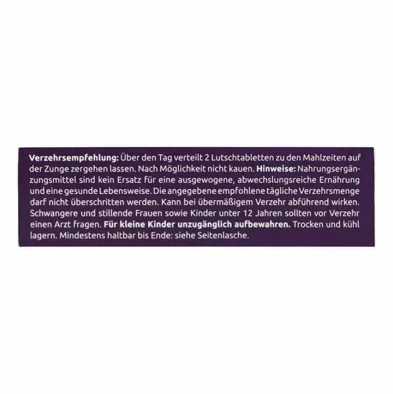 Verzehrsempfehlung: Über den Tag verteilt 2 Lutschtabletten zu den Mahlzeiten auf der Zunge zergehen lassen. Nach Möglichkeit nicht kauen.