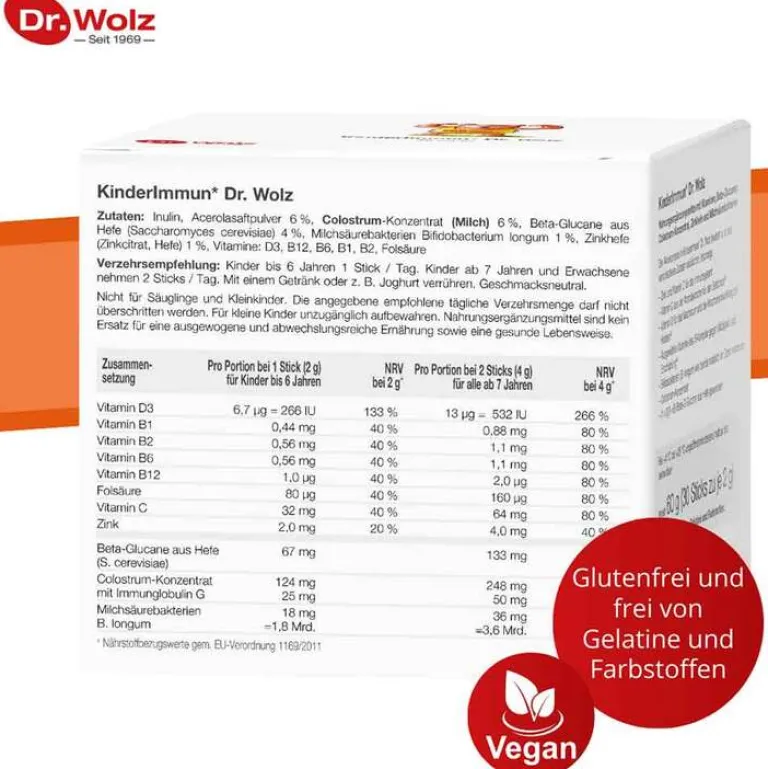 KinderImmun Dr. Wolz besteht aus verschiedenen natürlichen und wertvollen Inhaltsstoffen für ein gesundes Immunsystem. KinderImmun Dr. Wolz wurde für die ganze Familie, Schwangere und Stillende entwickelt. Das Präparat wird bei besonderen Belastungen und im Wachstum empfohlen. Außer wichtigen Vitaminen und Spurenelementen enthält KinderImmun Dr. Wolz Milchsäurebakterien, Colostrum und Inulin.