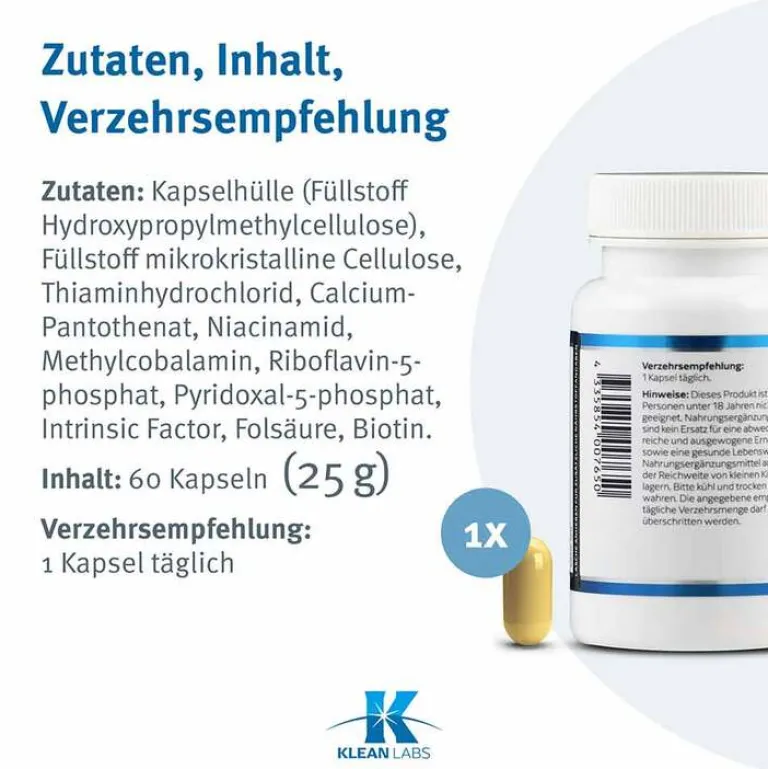 Kapselhülle (Füllstoff Hydroxypropylmethylcellulose), Füllstoff mikrokristalline Cellulose, Thiaminhydrochlorid, Calcium-Pantothenat, Niacinamid, Methylcobalamin, Riboflavin-5-Phosphat, Pyridoxal-5-phosphat, Intrinsic Factor, Folsäure, Biotin.