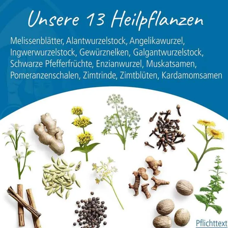 1 ml Lösung enthält: 1 ml Misch-Destillat aus Melissenblätter, Alantwurzelstock, Angelikawurzel, Ingwerwurzelstock, Gewürznelke, Galgantwurzelstock, Schwarze Pfefferfrüchte, Enzianwurzel, Muskatsamen, Pomeranzenschale, Zimtrinde, Zimtblüten, Kardamomensamen (53,6:71,4:71,4:71,4:28,5:28,5:7,1:71,4:7,1:71,4:32,1:3,6:1), Destillationsmittel: Ethanol 96% (V/V) und Wasser