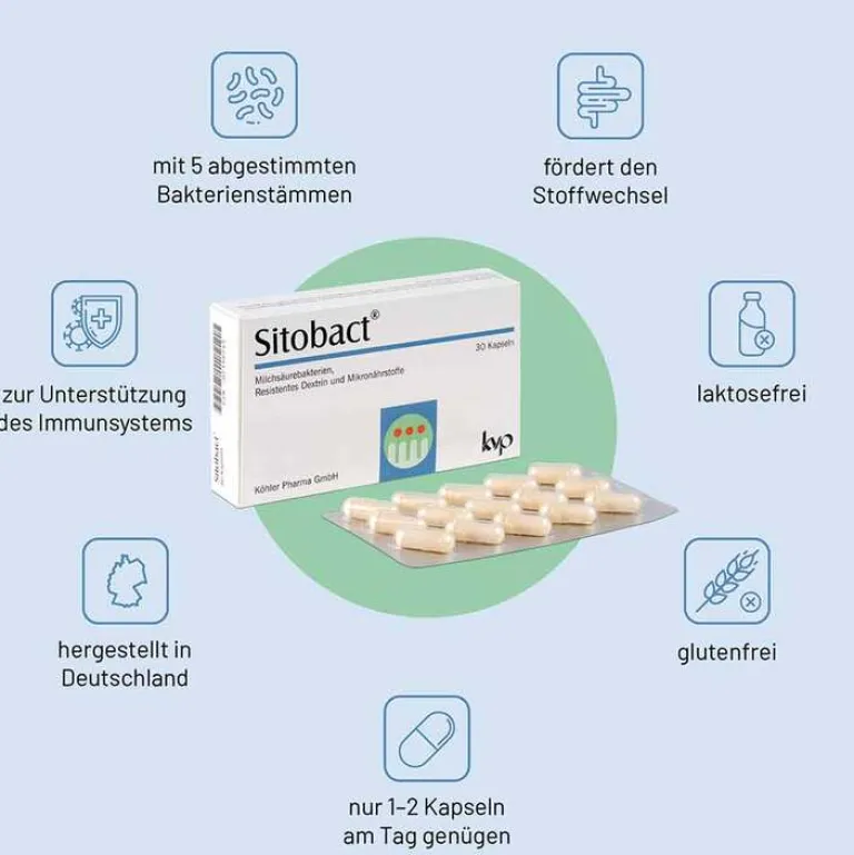 Sitobact enthält einen aufeinander abgestimmten Mix von fünf Stämmen probiotischer Milchsäurebakterien. Die Milchsäurebakterien sind dabei für die Magenpassage besonders „verpackt“, damit sie lebend in den Darm gelangen. Mit dem zugefügten Präbiotikum Inulin wird gleichzeitig die Ernährung der zugeführten Milchsäurebakterien sichergestellt. Darüber hinaus enthält Sitobact die essentiellen Mikronährstoffe Zink, Folsäure, Vitamin D3 und Vitamin B12, um so zusätzlich die Funktion des Immunsystems zu unterstützen.